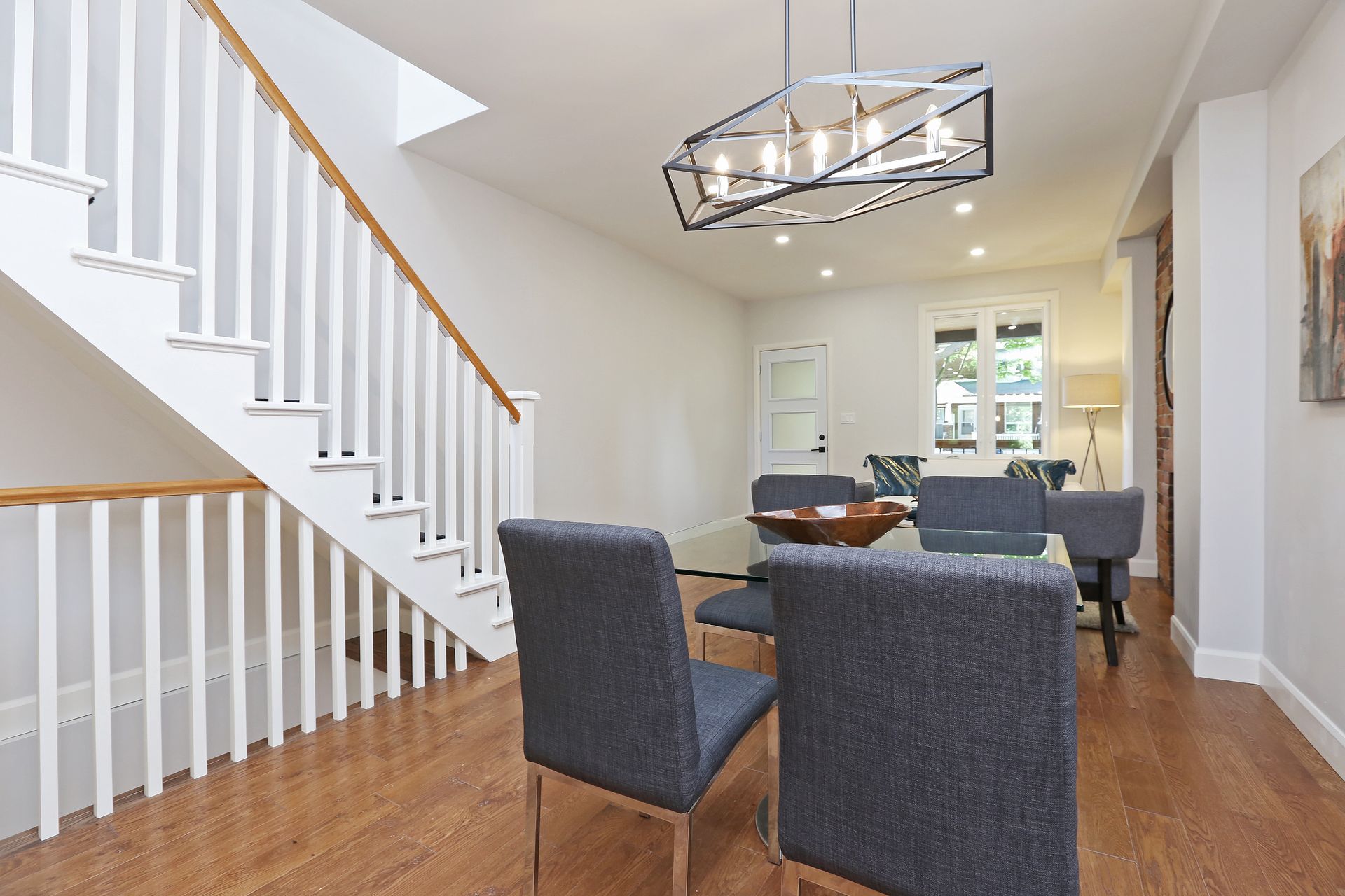 Beautiful renovation in fabulous Leslieville - feels like a new home! Features open concept living/dining area with handscraped oak floors & an exposed brick fireplace. Easy flow entertaining in the gorgeous kitchen with silestone counters & a walk-out to a deck & private tree-lined yard. Decadent spa bath with glass shower & soaker tub. Vaulted ceiling in Master bedroom & brick feature wall. Skylight on 2nd floor = tons of sunlight! Finished high basement rec room boasts an oversized custom 3 piece bath. 1 car pkg off lane. Quick stroll to Queen St. shops, eateries and TTC. Greenwood Park just steps away.